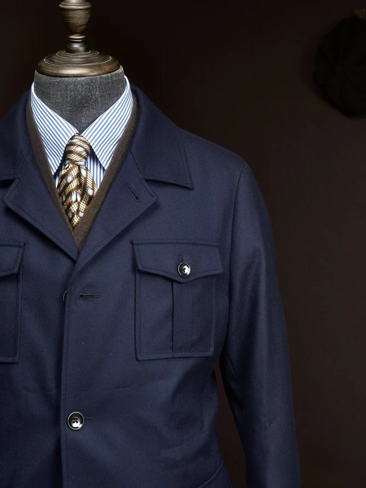 Four prominent bellows pockets with secure button-down flaps define the front, offering a balanced look that is as functional as it is stylish. We finish the piece with reinforced cuffs and a tailored lapel that sits comfortably against a shirt and tie. This jacket is designed for the man who values a disciplined aesthetic without compromising on everyday utility.