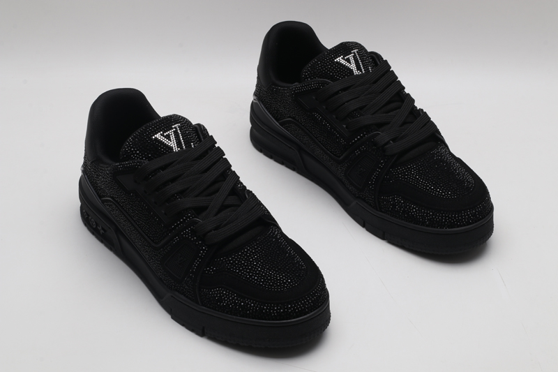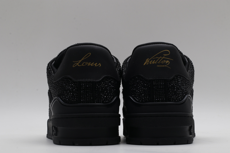 Experience effortless versatility (within a high-fashion context) as these Louis Vuitton LV Trainer Crystal Embellished Sneakers elevate any evening or high-end urban ensemble. Concurrently, their complete black hue, combined with the pervasive dazzling crystals, allows for a bold yet sophisticated pairing with various looks, adding an undeniable element of drama and luxury. Consequently, high-quality, all-black materials provide a uniquely luxurious feel with every stride. You are not just buying footwear; you are acquiring a highly coveted wearable work of art designed for discerning tastes and undeniable brand appeal. Ultimately, every component contributes to a holistic experience of comfort, cutting-edge design, and unparalleled, stealthy luxury.