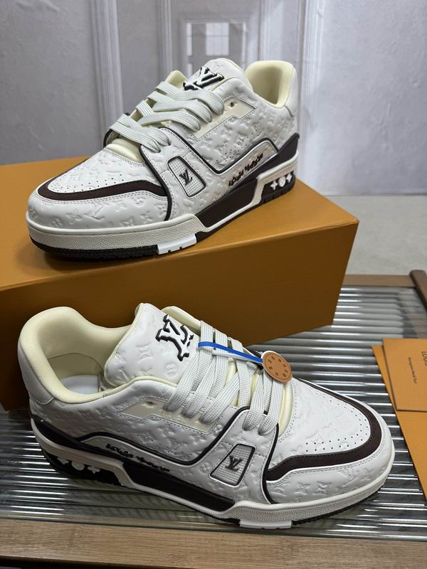 LV Unisex Trainer Sneakers in Cream Monogram Leather. First and foremost, our designers created this refined, “Off-White” silhouette for the individual who demands a classic athletic look but prefers the understated prestige of a soft, neutral palette. To achieve this, we utilize a premium mix of smooth cream leather and the iconic monogrammed canvas in tonal shades, creating a rich, multi-textured upper that radiates effortless style. Furthermore, this design features the signature low-top profile and intricate technical stitching that pays homage to the golden era of court performance. Consequently, it serves as the definitive choice for those who want to project a sense of “Quiet Luxury” while maintaining a commanding presence in the streets.