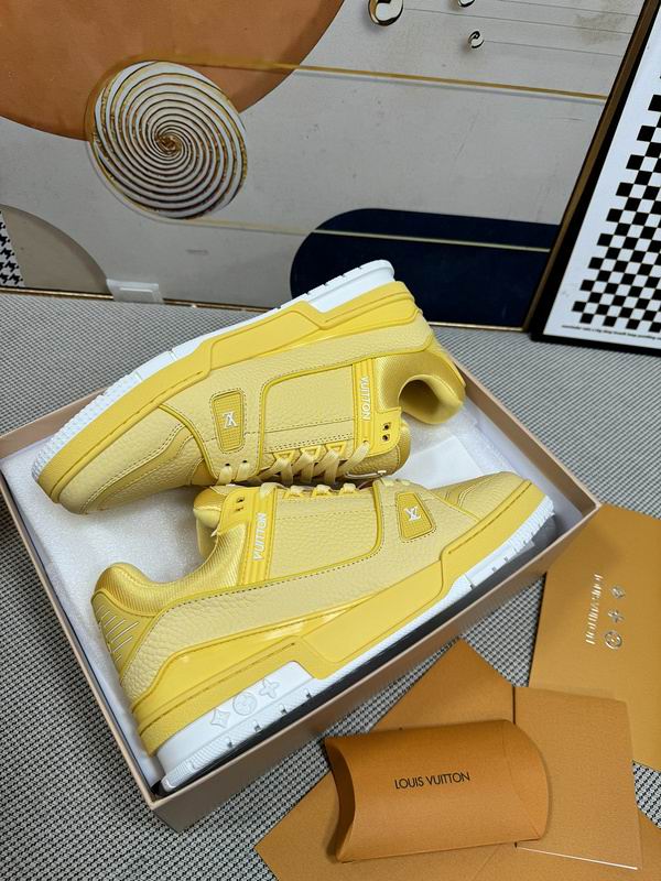 We fuse the nostalgic energy of vintage basketball footwear with high-fashion sophistication in the LV Unisex Trainer Sneakers in Saffron Yellow Leather. First and foremost, our designers created this vibrant, high-impact silhouette for the individual who demands a classic athletic look but prefers a bold, “Solar-Luxe” aesthetic. To achieve this, we utilize a premium, high-grade leather drenched in a rich, saturated saffron yellow that radiates confidence and artisanal elegance. Furthermore, this design features the signature low-top profile and intricate technical stitching that pays homage to the golden era of court performance. Consequently, it serves as the definitive choice for those who want to project a sense of unified, high-energy style while maintaining a commanding presence in the streets.
