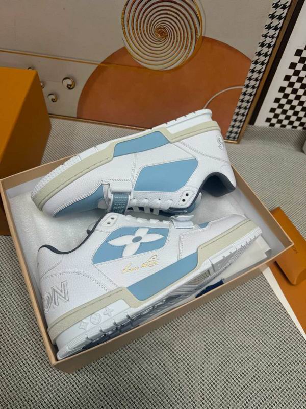 We fuse the nostalgic energy of vintage basketball footwear with high-fashion sophistication in the LV Unisex White and Blue Trainers with Monogram Strap. First and foremost, our designers created this iconic silhouette for the individual who demands a classic athletic look but refuses to compromise on the refined prestige of a world-class luxury house. To achieve this, we utilize a premium mix of crisp white leather and deep blue overlays, creating a multi-textured upper that radiates timeless style. Furthermore, this design features the standout Monogram Velcro strap across the midfoot, which serves as a powerful artistic focal point and pays homage to the golden era of court performance. Consequently, it serves as the definitive choice for those who want to project a sense of “Logomania-Luxe” while maintaining a commanding presence in the streets.