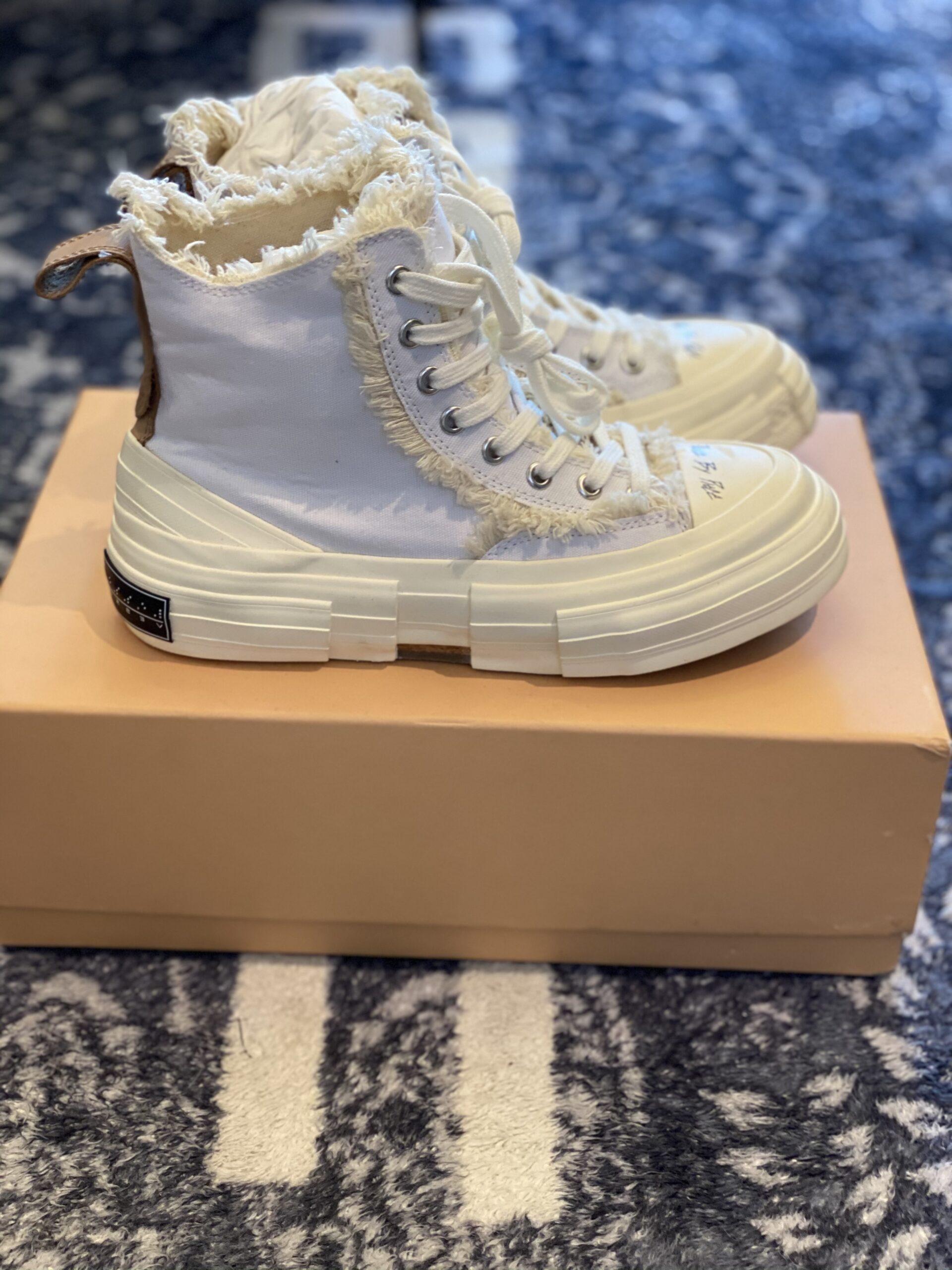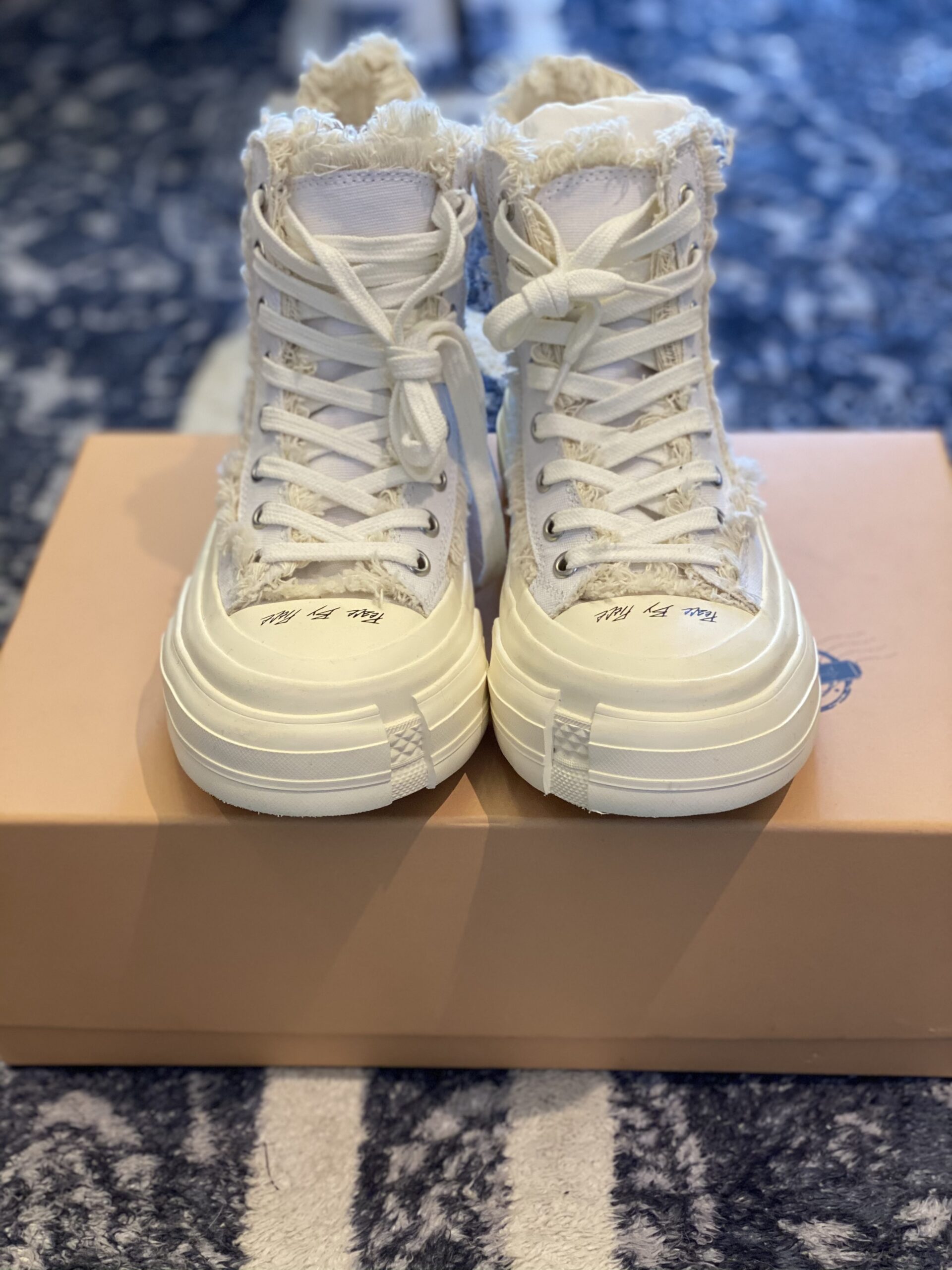 Step into the world of avant-garde streetwear with these Mihara Yasuhiro Peterson OG Sole Canvas High-Top Sneakers. These sneakers feature a durable white canvas upper characterized by unique frayed and distressed edges for a raw, industrial look. Specifically, the “distorted” hand-molded rubber midsole provides a signature melted aesthetic that defies traditional footwear design. This artistic approach ensures your style remains at the absolute forefront of contemporary fashion.