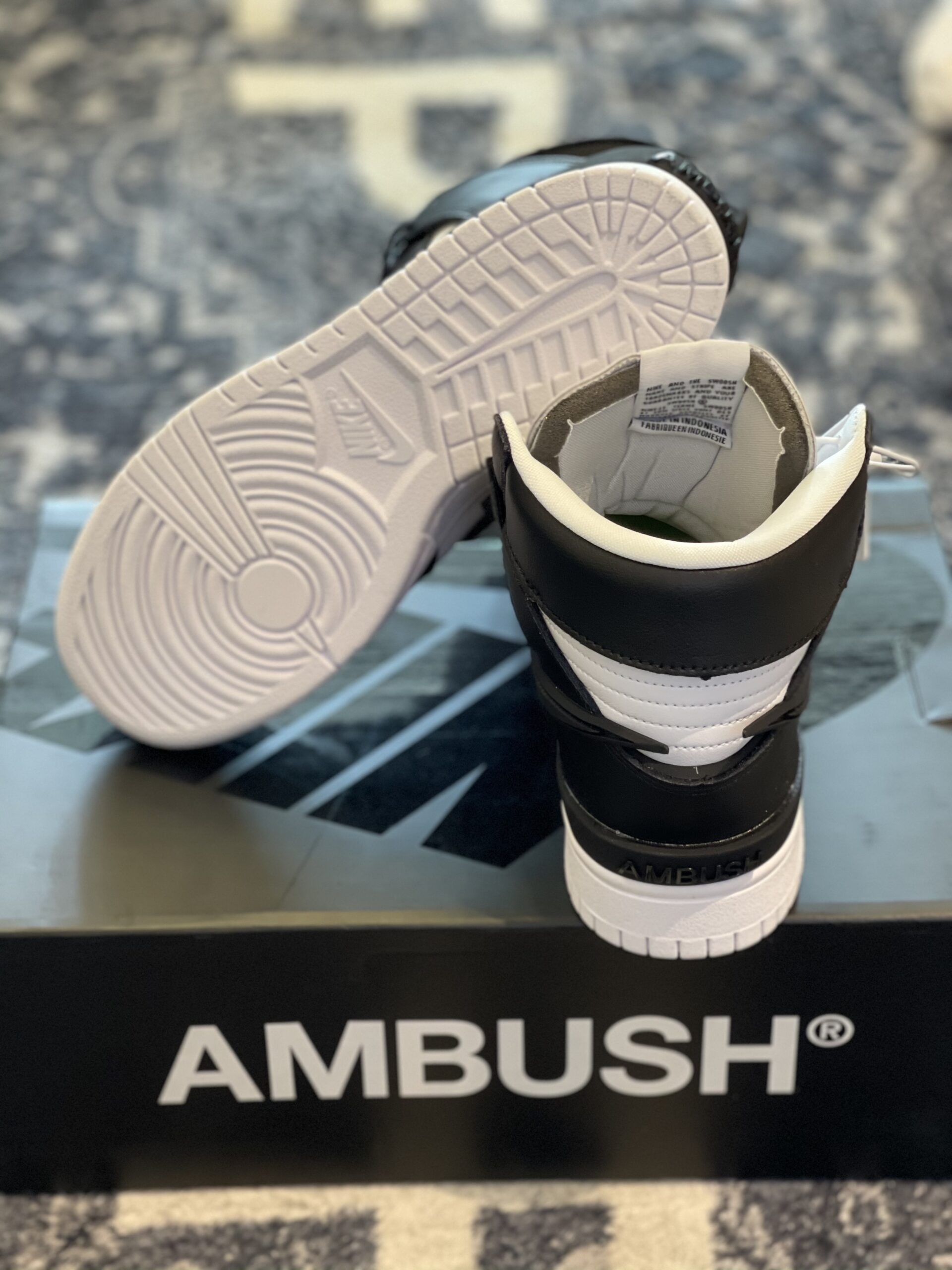 Redefine your footwear limits with the Nike Dunk High x AMBUSH “Black White.” This collaboration pushes the boundaries of traditional sneaker design. Sleek black leather overlays wrap around a crisp white base effortlessly. The standout feature includes an exaggerated, oversized Swoosh that extends beyond the heel. This architectural detail draws inspiration from motorcycle culture and high-speed motion.